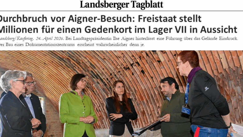 Landtagspräsidentin Ilse Aigner (CSU), die künftige Landrätin Daniela Groß (Grüne) und Landtagsabgeordneter Alex Dorow (CSU) zu Besuch auf Lager VII. Das Landsberger Tagblatt berichtet über den Besuch und über den aktuellen Stand der Verhandlungen mit dem Freistaat. https://www.augsburger-allgemeine.de/landsberg/landtagspraesidentin-ilse-aigner-besucht-das-ehemalige-kz-aussenlager-kaufering-vii-113977902